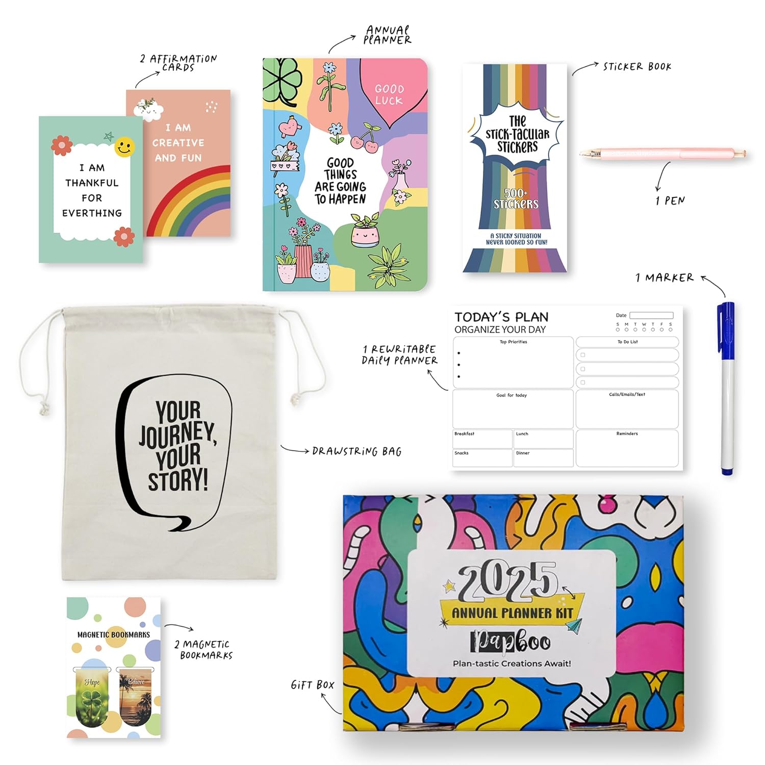 - THE ULTIMATE PLANNING KIT: Stay organized and inspired with our all-in-one Undated Planner Journal Kit! This comprehensive kit includes a stylish drawstring bag, a rewritable daily planner with marker, a fun-filled 500+ Sticker Book, 2 uplifting affirmation cards, 2 magnetic bookmarks, and an inspiring pen to kickstart your creativity.