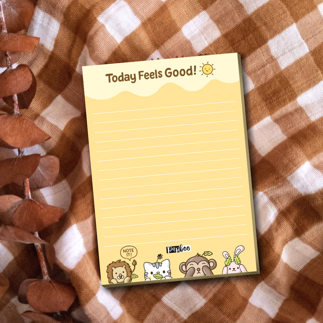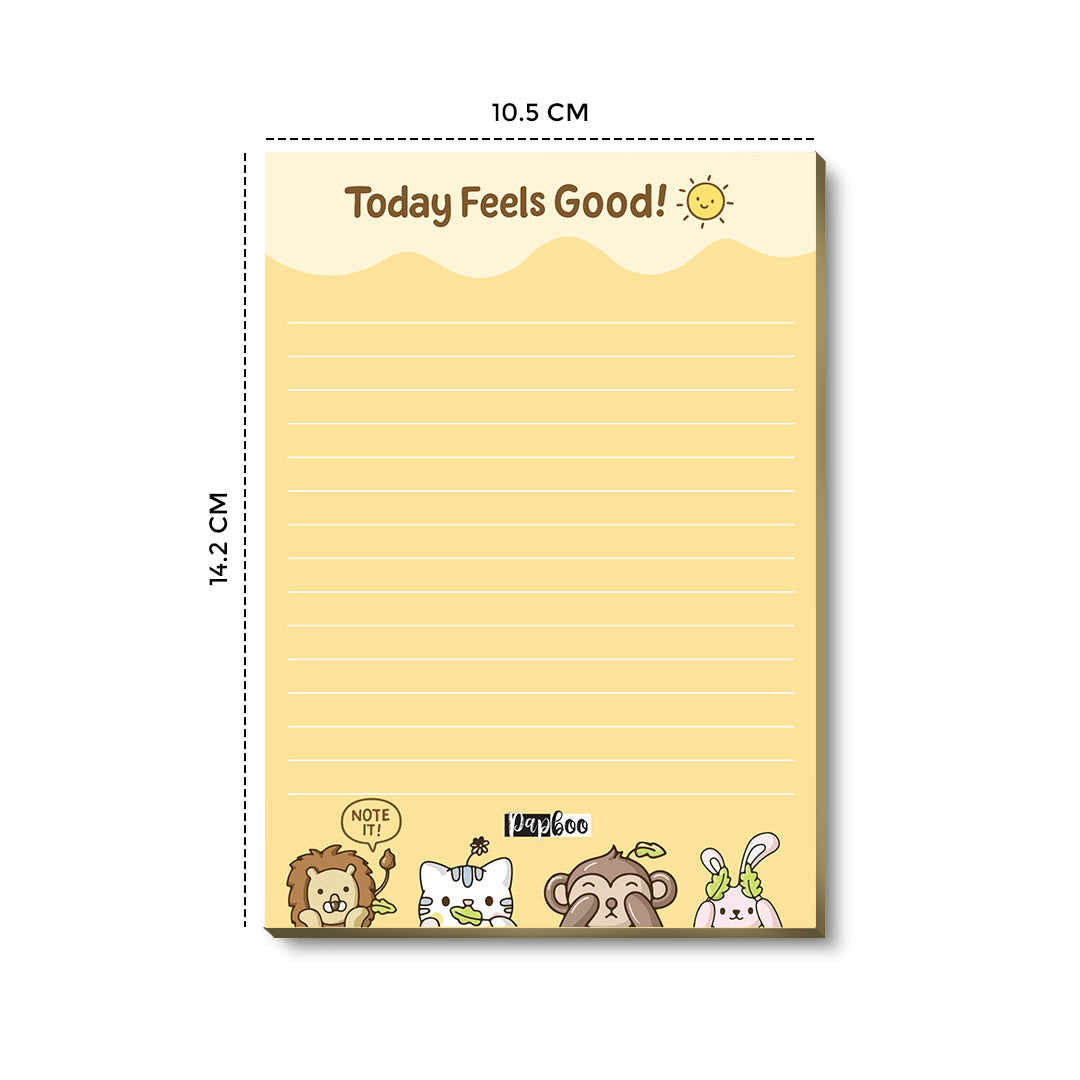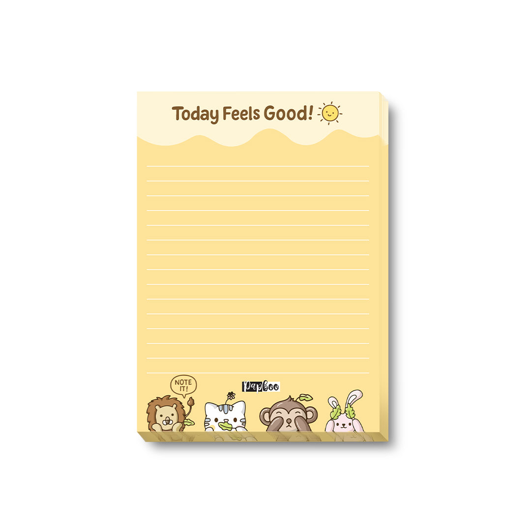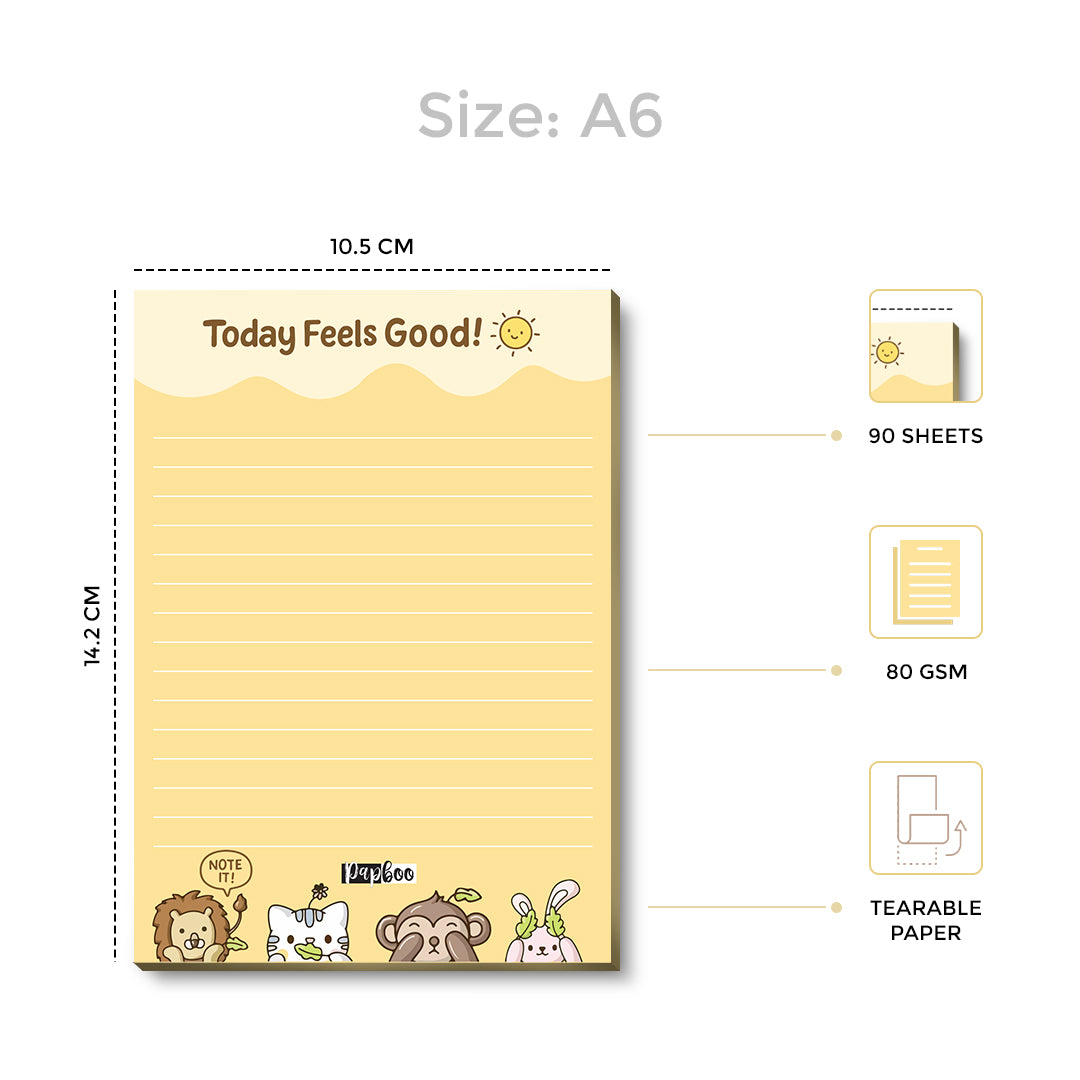 With a vibrant yellow backdrop and playful animal illustrations at the bottom, this notepad radiates joy. The pastel color palette, combined with cute characters, makes even the most boring tasks feel lighter. Compact in size and printed on high-quality 80 GSM paper, it’s perfect for quick notes, gratitude lists, or little “feel good” thoughts.